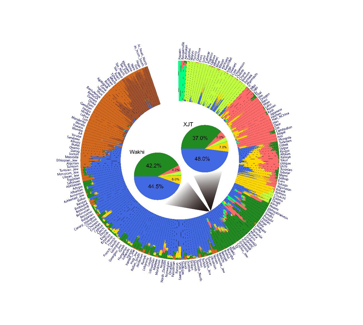 世居巴基斯坦、阿富汗、塔吉克斯坦和中国新疆环绕交界处的帕米尔瓦罕人自古以来就是连接东亚、中亚和南亚文化交融和贸易往来的重要桥梁,但关于瓦罕人的起源和演化历史仍然知之甚少。该研究采集了8个帕米尔瓦罕人的基因组数据,结合中国新疆塔吉克人群以及世界人群的参考数据进行了综合分析,发现瓦罕人和新疆塔吉克人具有相对更近的遗传关系。研究发现瓦罕人的祖源构成中超过85%来自西欧亚人群(西欧~44.5%;南亚~42.2%),少量来自东欧亚人群(西伯利亚~6.0%;东亚~4.3%)(图1)。
