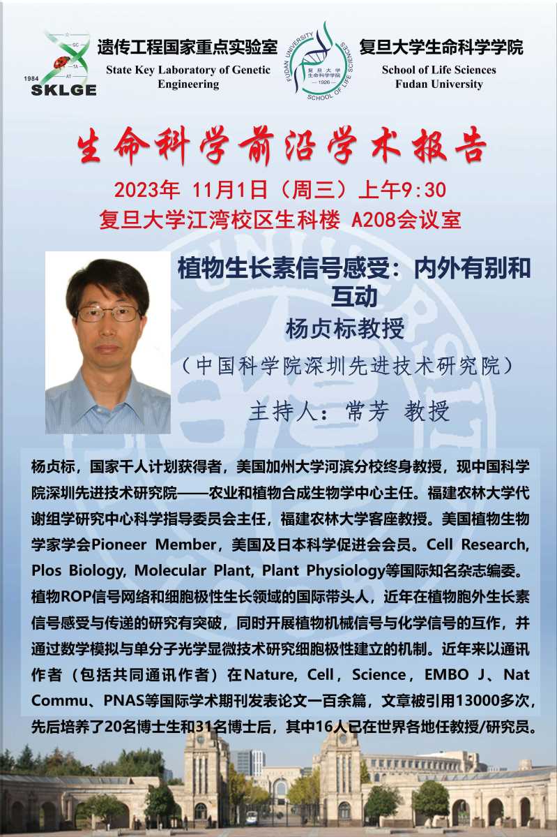 生命科学前沿学术报告-2023-11-01(周三)9:30,杨贞标 教授(中国科国产无码深圳先进技术研究院)