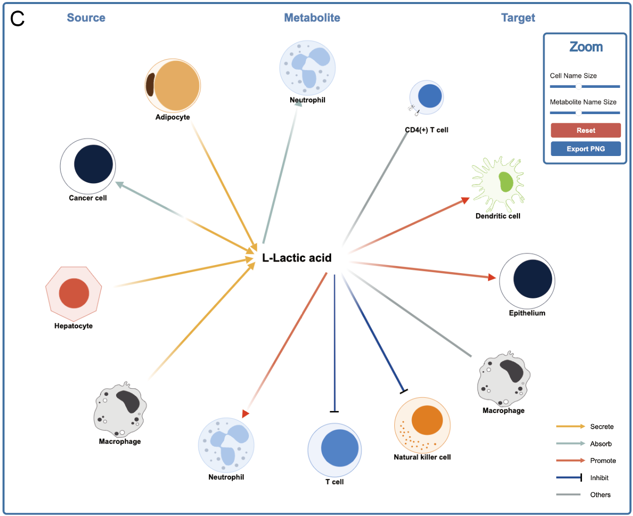 MACC 1.0聚焦于人类内源性代谢物,基于文献挖掘算法筛选了约150万篇与代谢物相关的研究论文,经多轮人工校验后整合为高质量代谢物介导的细胞相互作用,收录了细胞间通过代谢物的分泌和吸收进行远程通讯的信息,以及由此对靶细胞产生的下游生物功能注释。MACC作为配体-受体介导的细胞间相互作用关系的有力补充,为解析细胞间通讯提供新的视角。知识库在线链接: