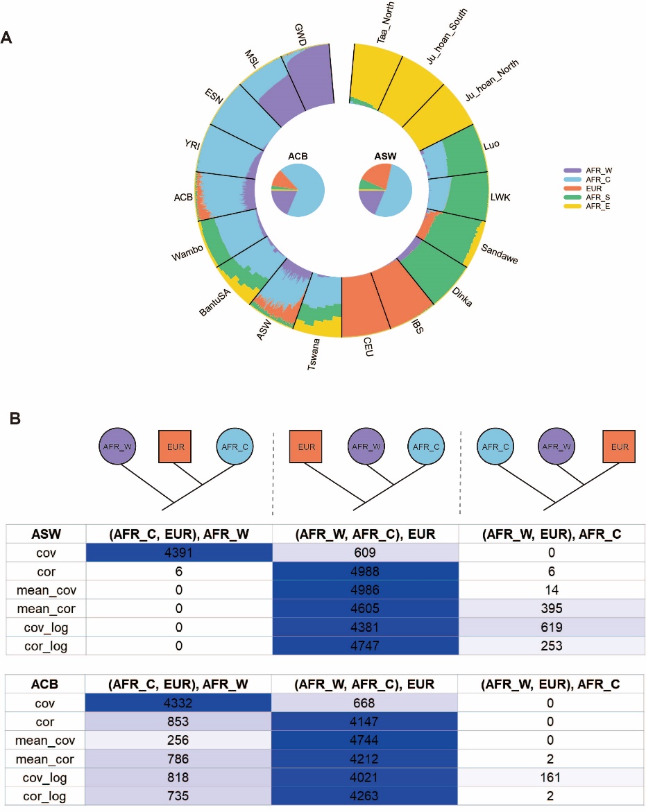 A) 真实数据集的 ADMIXTURE 结果 (祖源个数设定为5),用 AncestryPainter 2.0 中的“sectorplot”函数绘制; B) 使用 AHG 推断真实人群的混合顺序。拓扑结构“(A,B),C”表示祖源A与祖源B混合,然后祖源C加入已经混合的祖源。每个拓扑结构的支持数量由渐变色(高:蓝色;低:白色)表示。缩写:AFR_W - 西非血统,AFR_C - 西非/中非血统,AFR_E - 东非血统,AFR_S - 南部非洲血统,EUR - 欧洲血统。