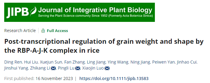 2023年11月16日,国产无码 罗小金/陆平利团队联合中国农科院黎志康团队在JIntegr Plant Biol期刊上发表了题为“Post-transcriptional regulation of grain weight and shape by the RBP-A-J-K complex in rice (Oryza sativa L.)”的研究论文。该研究采用图位克隆、功能基因组、转录组以及群体基因组的研究方法,发现 RBP-A、RBP-J和 RBP-K编码的蛋白质形成了一个 RBP-A-J-K 复合物,对水稻产量相关性状起负调控作用。