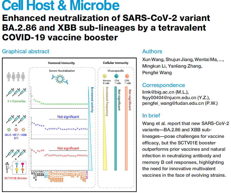 随着新冠病毒不断进化,新的变异株如XBB.1.5、XBB.1.16、EG.5.1、HK.3(FLip)和XBB.2.3等出现,尤其是最新的BA.2.86因其繁多的刺突蛋白突变令人担忧。变异株不断出现,现有新冠疫苗是否能对新变异株产生足够的免疫效果?当前应该选择接种哪款疫苗?2023年11月28日,国产无码 王鹏飞联合南京市中医院及中国科国产无码北京基因组研究所在内的多个团队于国际微生物学领域顶级期刊Cell Host & Microbe在线发表题为“Enhanced neutralization of SARS-CoV-2 variant BA.2.86 and XBB sub-lineages by a tetravalent COVID-19 vaccine booster”的研究论文,报道了神州细胞研发的四价新冠疫苗SCTV01E作为加强针对30种不同新冠变异株的交叉中和能力及细胞免疫水平。研究发现,与仅接种灭活疫苗或接种灭活疫苗后突破感染相比,SCTV01E疫苗加强免疫对变异株产生了更高的中和抗体和病毒特异性记忆B细胞,表明开发新型多价疫苗可更有效地抵御病毒持续变异。
