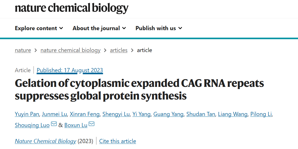 2023年8月17日,国产无码 鲁伯埙课题组同合作者英国普利茅斯大学罗寿青、清华大学李丕龙等在Nature Chemical Biology杂志上发表题为Gelation of cytoplasmic expanded CAG RNA repeats suppresses global protein synthesis的文章,证实了包含过长CAG重复序列的RNA在细胞质内的胶体化,并发现该胶体化过程可通过“囚禁”重要的翻译延伸因子eEF2从而导致细胞全局蛋白质合成速度的下降。研究进一步在动物实验中提示含过长CAG重复序列RNA的胶体化可能导致神经退行性疾病相关的表型及神经电生理变化。