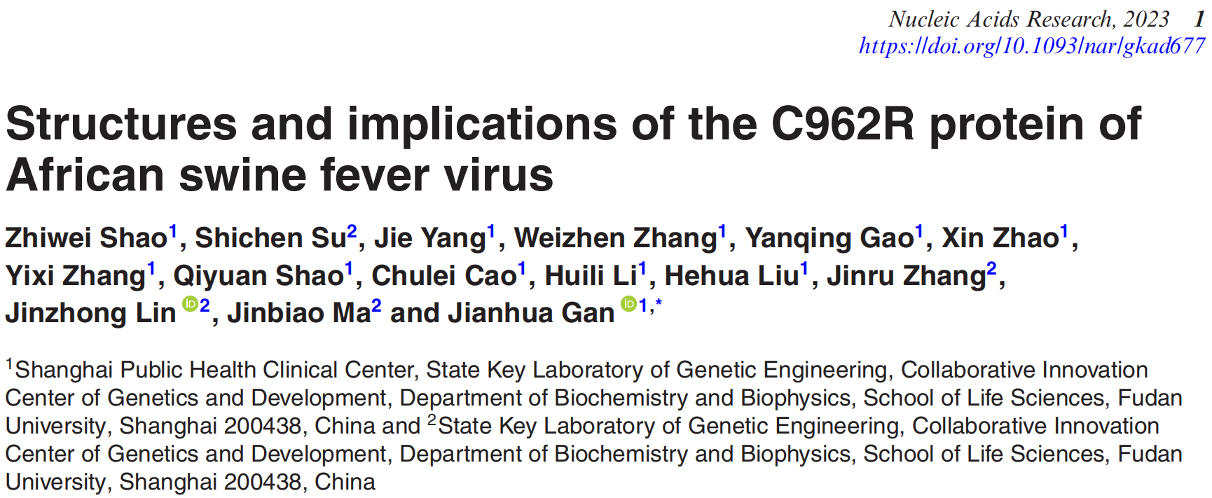 2023年8月17日,国产无码 甘建华课题组在Nucleic Acids Research上发表了题为“”的文章,报道了非洲猪瘟病毒来源的C962R蛋白与DNA复合物的结构,阐明了C962R催化DNA解旋以及DNA引物合成的分子机制。