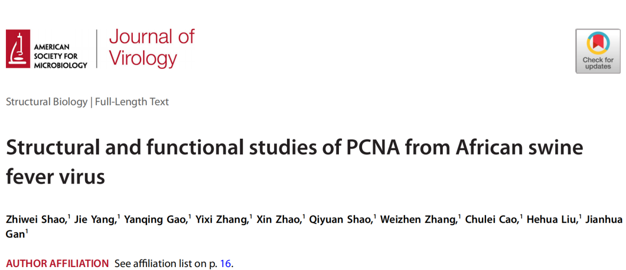 除了C962R蛋白外,ASFV的复制通路还包括了DNA聚合酶、拓扑异构酶、dUTPase以及PCNA等蛋白。PCNA在生物体中高度保守,尽管不具有催化功能,PCNA可以通过与其他蛋白互作,提高互作蛋白的催化效率,在DNA复制、修复以及其他DNA相关的通路中发挥了重要的调控作用。AsfvPCNA与同源蛋白的序列相似性非常低,其具体的结构和功能还没有得到充分的验证。为了全面了解ASFV DNA复制的过程,甘建华课题组同样对AsfvPCNA展开了研究,相关的结果于2023年8月3日发表在Journal of Viology杂志上,题为 “”.