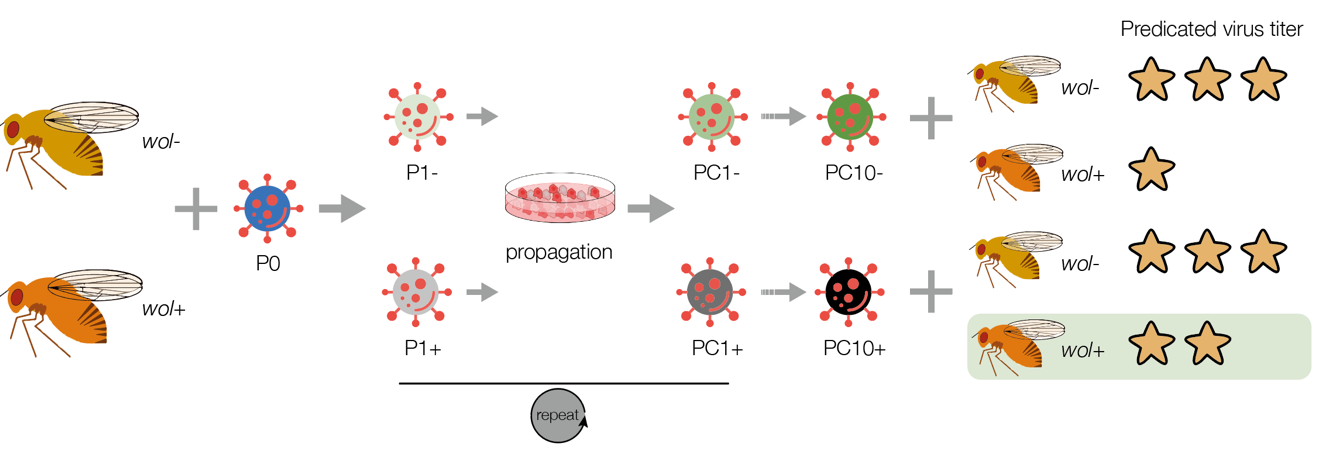蚊子等昆虫感染内共生菌Wolbachia可获得强效的抗病毒能力,且该能力可通过母系传播的方式传递给子代。利用这两项生物学特性,World Mosquito Program在印度尼西亚、斐济和厄瓜多尔等多大洲多国家释放了超过百万只Wolbachia+蚊子,有效的阻断了当地包括登革热、寨卡和西尼罗河热等虫媒病毒的传播,部分地区疫病感染率下降了超过80%。病毒能否突破Wolbachia的保护效应?是否会在选择压力下进化出超级病毒?因此,解析Wolbachia/宿主/病毒三者的共进化,对于评估WMP项目的安全性具有重要的现实意义。目前,我们建立了X病毒/Wolbachia/宿主的代纪进化体系,欢迎对该项目感兴趣的同学加入(图2)。