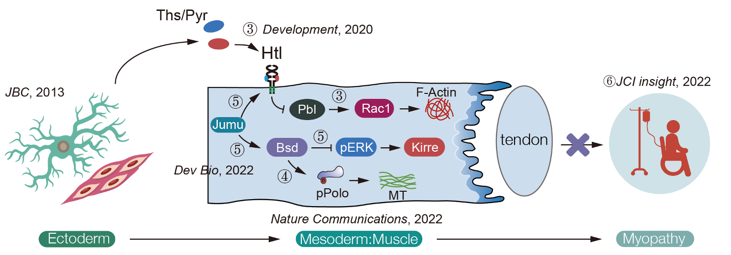 从单细胞动物发展到多细胞动物,是动物进化史上的一个飞跃。从多细胞动物开始,动物身体的各个部分为适应外界环境而逐渐分化为具有特定功能的器官。经典理论认为,各器官的功能受到内分泌系统和神经系统的调控。而近些年的研究发现,除了神经/激素调控之外,不同器官之间可通过代谢小分子和非激素类分泌性蛋白实现相互调控,这种调控机制被称为信号的跨器官传递(Inter-organ communication networks, ICN)。ICN可以主动/被动响应多种病理变化,参与调控并维持机体器官正常生理功能和整体稳态。例如,ICN异常,与心脏瓣膜病、非酒精性脂肪肝、慢性肾炎等多种疾病的发生息息相关。因此,解析ICN,不仅可以增强我们对生命体器官间调控网络的认知,更可以为介入治疗系统性炎症风暴、神经损伤、肌无力等ICN相关疾病提供依据。特别的,ICN研究对模式动物多器官协同遗传操作的可行性和便捷性提出了很高的要求。借助于果蝇的遗传学操作优势,课题组成功解析了:天然免疫通路“肠-肝”之间的时空传递机制;依赖于“外胚层-肌肉”跨器官信号的肌肉发育双重调控网络;炎性因子介导的“大脑-肌肉”信号轴。我们的研究为深入探索器官间调控网络,建立维持多器官稳态的分子图谱,阐发系统性炎症的治疗策略,解析遗传性肌肉疾病的致病机理等,提供了完善的理论支撑,并为今后工作提供了成熟的平台和研究策略。