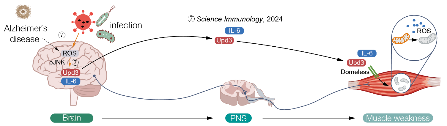研究表明,感染/神经退行性疾病均可导ROS在脑组织中的堆积,过量的ROS可诱导炎症因子IL-6 (Upd3)的表达。神经来源的IL-6 /Upd3可穿透血脑屏障,进入循环系统,从而激活肌肉JAK/STAT通路,最终影响肌肉中线粒体功能和肌肉表现(图4 通路⑦)。