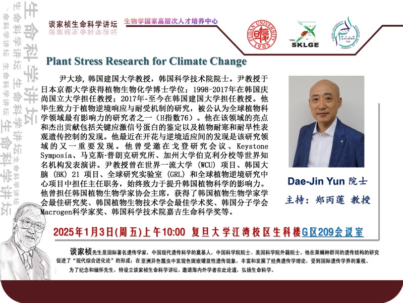 谈家桢生命科学讲坛-2025-1月3日(周五)10:00,Dae-Jin Yun(尹大珍) 教授(韩国建国大学)