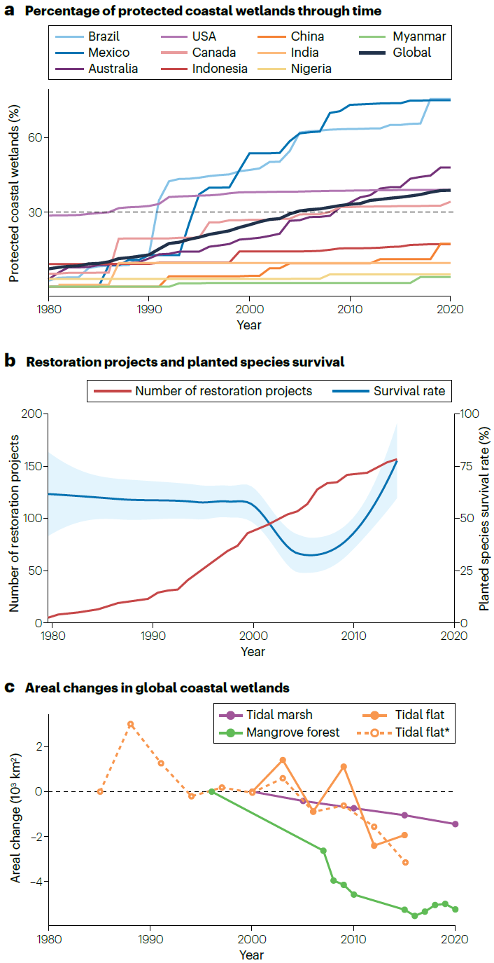 通过分析全球滨海湿地保护地和修复工程发现,虽然就全球平均而言,滨海湿地保护地已超过了滨海湿地总面积的30%,但保护修复状况在不同国家和地区之间差异明显,保护修复成效往往缺乏长期评估,盐沼、红树林、潮滩等滨海湿地的持续丧失态势在全球范围内尚未得到逆转。未来需要在局域、区域和全球等多个尺度上,推动滨海湿地保护修复从重点关注湿地面积向着力提升湿地质量和韧力转变,促进滨海湿地生态保护修复的提质增效。
