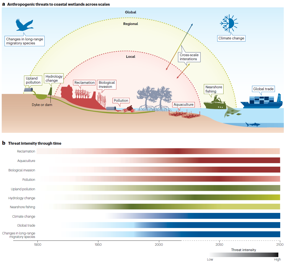 通过整合分析不同空间尺度上滨海湿地人为胁迫的变化趋势,研究提出,虽然近年来随着保护力度的强化,围垦、捕捞等一些局域尺度人为胁迫在部分国家或区域已开始减弱,但养殖、生物入侵、气候变化等人为胁迫,特别是区域尺度和全球尺度上的人为胁迫,预期在未来仍将持续加剧。这些区域和全球尺度的人为胁迫虽在短期内常不会直接导致滨海湿地的大幅丧失,但可通过影响生物多样性等而降低滨海湿地的质量。