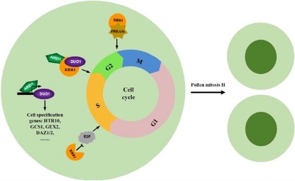 植物中,精细胞的形成涉及两轮花粉的有丝分裂,其中减数分裂的产物小孢子启动第一次有丝分裂(PMI)产生一个营养细胞和一个生殖细胞,生殖细胞继续进行第二次有丝分裂(PMII)产生两个精细胞。DUO1是一个Myb转录因子,在生殖细胞中被激活以促进PMII,其功能的缺失导致PMII完全停滞,只产生单个类精细胞的花粉,植物完全不育。尽管DUO1的重要性已被证实,但其如何被精确调控以及PMII后如何防止细胞过度增殖的机制仍不清楚。