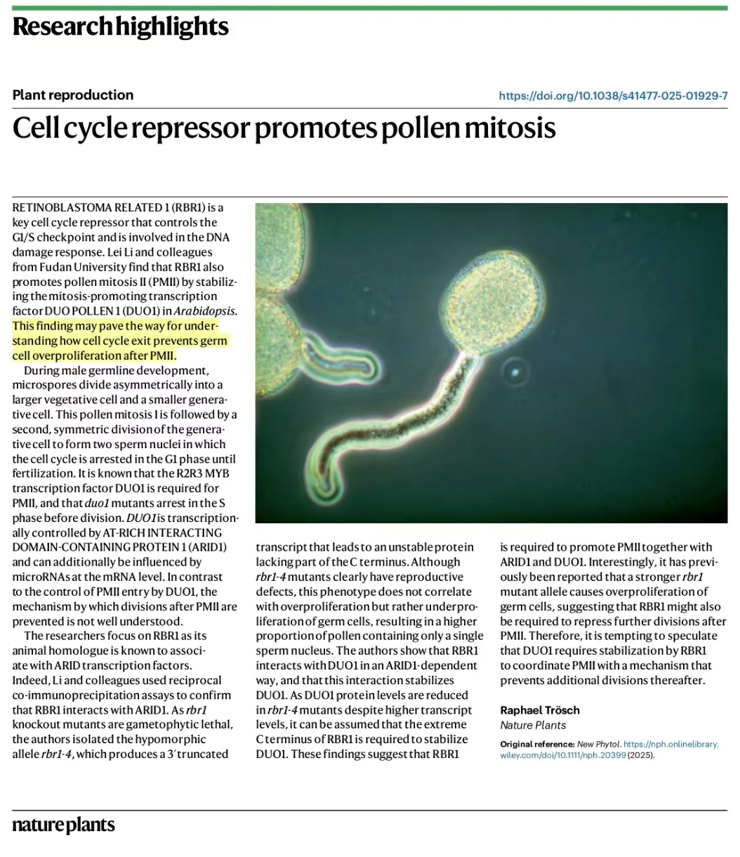 2025年2月5日,植物学著名期刊Nature Plants对于该工作发表了题为“Cell cycle repressor promotes pollen mitosis”的Research Highlight评述,认为该工作可能为理解细胞周期退出如何防止花粉PMII后的生殖细胞过度增殖铺平道路,对于理解细胞周期如何与精细胞成熟进程相协调的分子机制提供了新视角。