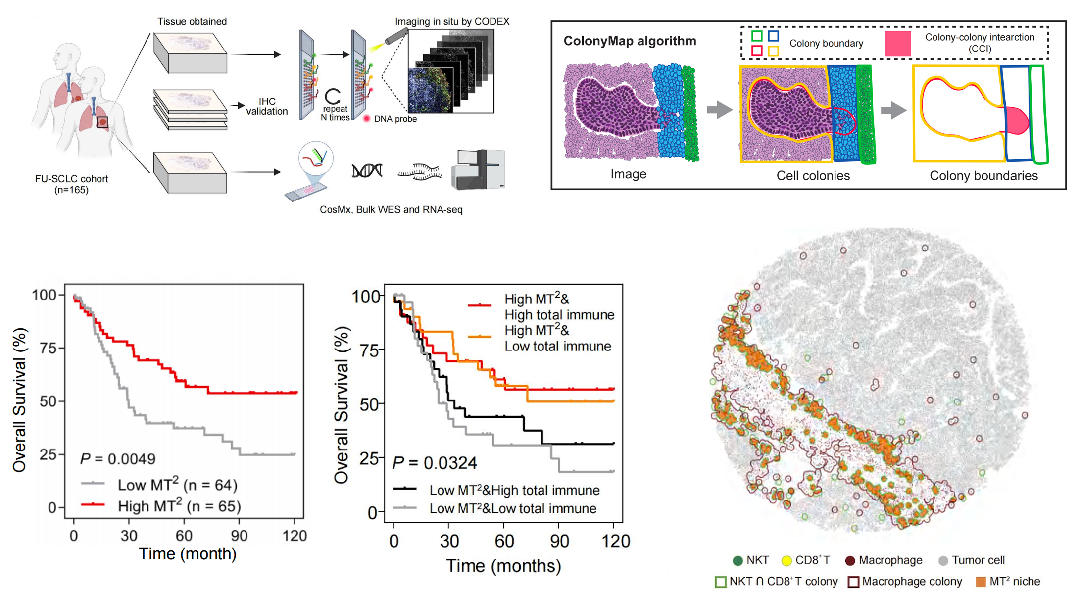 进一步,研究者在SCLC中发现了巨噬细胞、CD8+ T细胞及NKT细胞集落组成的亚组织结构(MT2)其富集程度与SCLC更好的生存预后显著相关,且不受整体免疫浸润影响。进一步通过CosMx技术,发现MT2内部的巨噬细胞呈现抗原呈递功能增强及T细胞激活特征,而T细胞耗竭状态更低,提示MT2结构可能有抗肿瘤免疫功能。