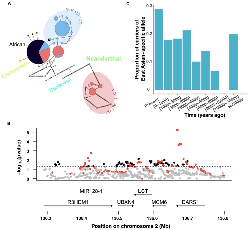 为追溯单倍型起源,研究团队整合尼安德特人和丹尼索瓦人等远古人类的全基因组测序数据,发现该东亚特异单倍型可能通过远古时期尼安德特人遗传渗入进入现代人基因组,并经历长期正向选择。古代人群的基因组数据显示这种单倍型在约1万年前已经普遍存在,对选择时间的估计也显示,该区域的自然选择约始于1万年前,早于东亚人群开始驯养动物及消费奶制品的时间,暗示牛奶消费引起的乳糖摄入并非东亚人群2q21.3区域适应性演化的初始驱动力(图2)。为探究该区域在东亚地区的选择机制,研究发现该单倍型可以影响2q21.3区域基因(如UBXN4、DARS1)在免疫细胞中的表达,并与白细胞和中性粒细胞计数变化显著相关,研究团队推测免疫相关的环境因素更可能是潜在的自然选择驱动力。